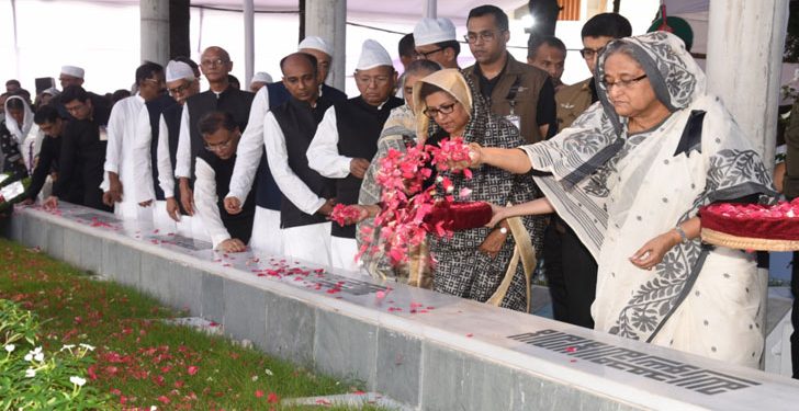 এর পর সকাল ১০টা ৭ মিনিটে প্রধানমন্ত্রী শেখ হাসিনা বঙ্গবন্ধুর সমাধিতে পুষ্পস্তবক অর্পণ করেন। এ সময় প্রধানমন্ত্রীকে সশস্ত্র বাহিনী গার্ড অব অনার দেয়। পরে প্রধানমন্ত্রী ফাতেহা পাঠ ও মোনাজাতে অংশ নেন। এর পর বেলা ১১টায় বঙ্গবন্ধুর সমাধিস্থলে বিশেষ দোয়া মাহফিল হবে।